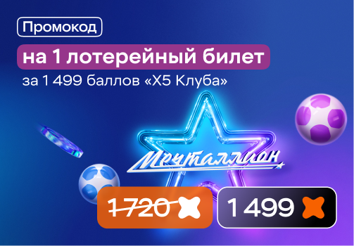- Обменять баллы на промокод лотерейного билета от бренда «Национальная Лотерея» можно до 10 раз в течение 1 календарного месяца на 1 аккаунт, который участвует в программе лояльности «Х5 Клуб»;