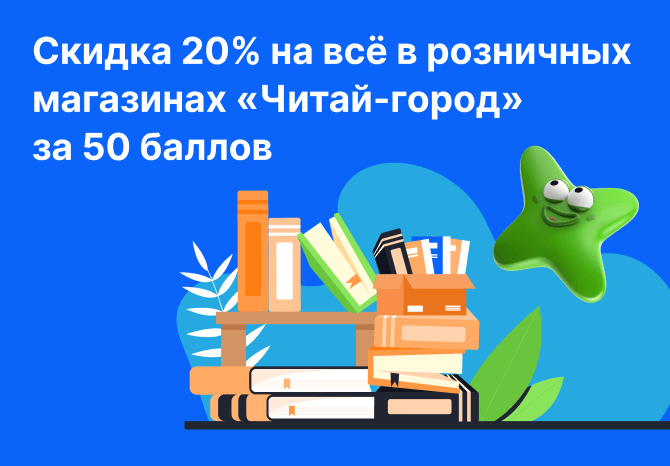 Скидка 20% на всё в розничных магазинах «Читай-город» за 50 баллов